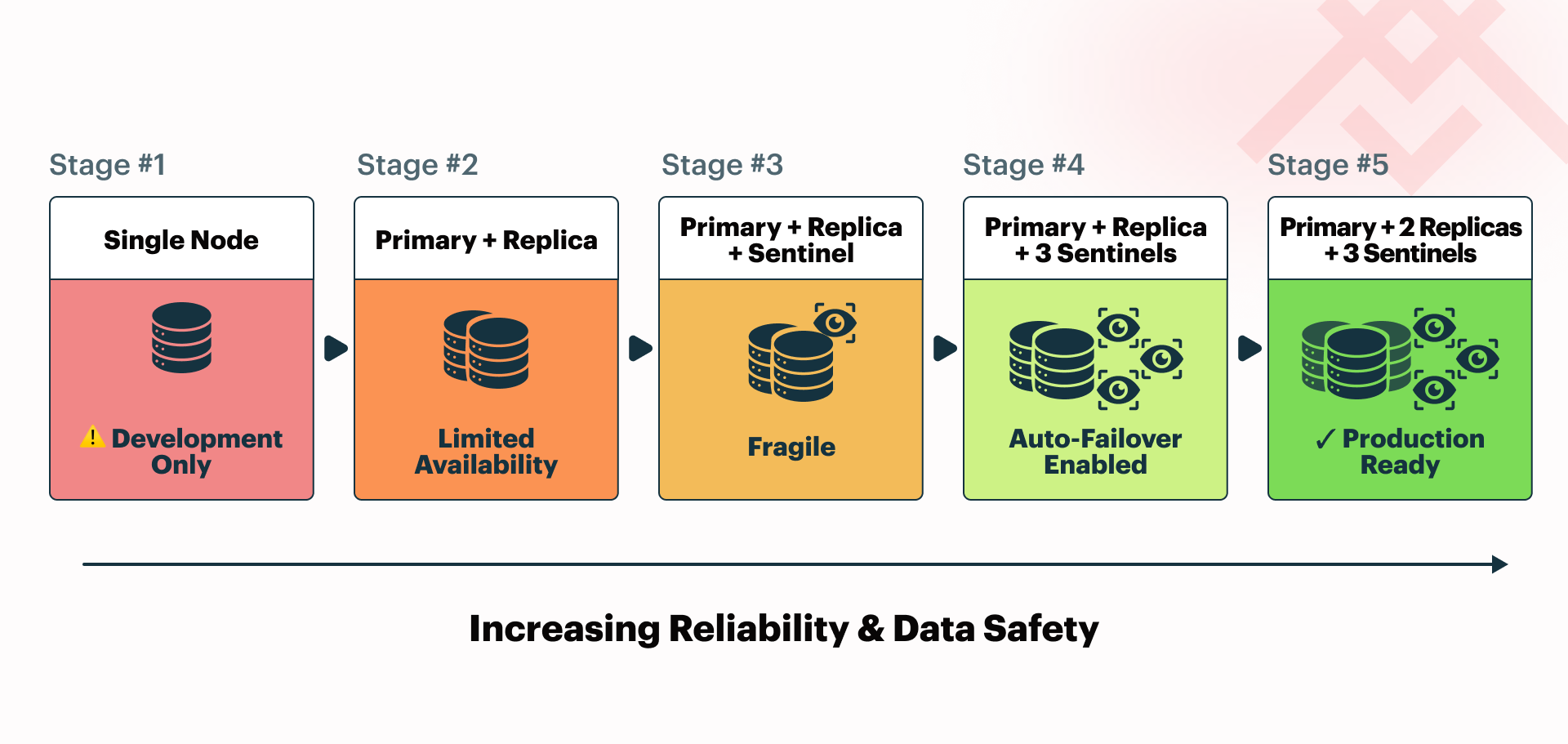 A more serious risk arises from hardware failure, such as disk corruption or complete server loss. In that scenario, you may permanently lose all local data unless you have external backups. For this reason, a single-node setup is generally unsuitable for most production environments. It may still be acceptable in cases where you can rebuild the dataset from another source or where reliable off-site backups (such as exported RDB files enable rapid recovery.