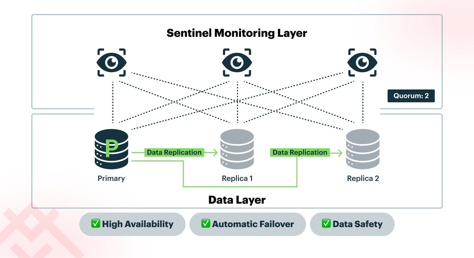 Surprisingly, having only two Sentinels makes deployment less reliable. An important Sentinel-related setting is quorum, which determines how many Sentinels need to agree to trigger a failover. With two Sentinels, it only makes sense to set it to either 1 or 2.